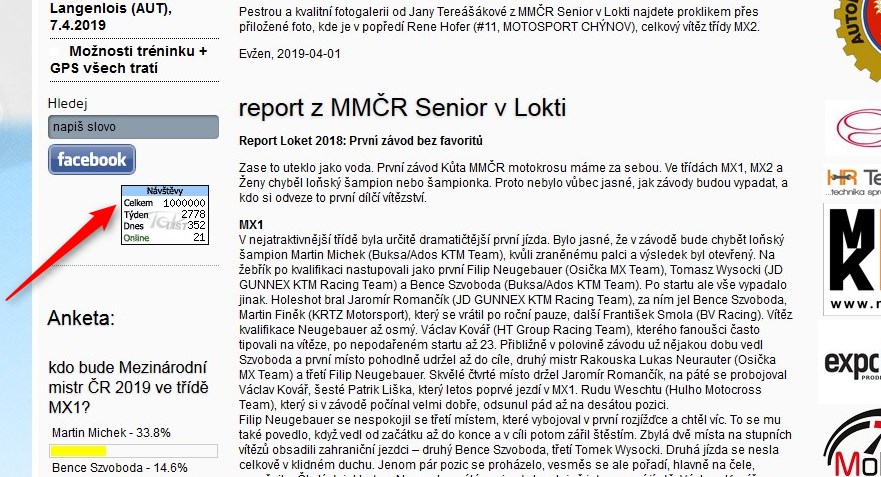 Dnes, tedy v pondělí, 1.4.2019 v 19:39 hod. zaznamenalo počítadlo návštěv našeho webu (TOP List) milióntého návštěvníka...! Za Vaši přízeň moc děkujeme, velice si jí vážíme a nadále se Vás budeme snažit zásobovat aktuálními informacemi kolem motokrosu...!