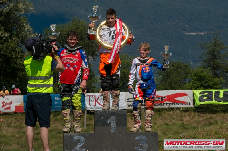Ve startovním poli osmdesátek, které letos ovládá Maďar Kristof Jakob, Němci Harms a Kees a domácí Dieminger, Schütz a Wibmer, se opět objevil Matyáš Chlum jako jezdec Motosportu Chýnov (na přiloženém snímku na stupních vítězů). Promluvil už do kvalifikace třetím nejlepším časem a dobře si vedl i v závodě. V první jízdě sice po slabším startu a pádech dojel sedmý, ve druhé ale dobře odstartoval a dostal se na druhé místo za Jakoba, které udržel do cíle. Mezi konkurenty s minimálními bodovými odstupy získal i celkové druhé místo. „S výsledkem spokojenost, na to, že 12 dní neseděl na motorce – byl se školou v Anglii – dobrý“, pochválil ho otec.