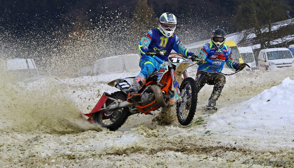 V hlavním závodě motoski se nejprve závodilo v kvalifikačních jízdách. Vzhledem k velkému počtu posádek se něketří neměli možnost ani kvalifikovat do finálových jízd, ti úspěšnější jeli finále B, ze kterého ještě dva nejlepší postupovali do hlavního finále A, v němž si přímou účast zajistili ti nejlepší k kvalifikací. V tomto finále neměl štěstí jeden z hlavních favoritů závodu Jan Charvát s Jakubem Hořejším (Promoto/AMK Votice). V jeden moment se dokonce dotáhli na vedoucí posádku, ale v důležitém okamžiku upadl Honzovi lyžař (což bylo při jeho stylu jízdy poměrně nasnadě:-), takže bylo finále z jejich strany celé taková stíhací jízda. Celkově to po dvou pádech stačilo i tak na pěkné páté místo. Zajímavostí je, že to pro Honzu to byla motoskijöringová premiéra. Na čtvrtém místě skončil dnes již zkušený motoskijöringový závodník František Svoboda s lyžařem Martinem Pokorným (Mlyny). Třetí místo nakonec vybojoval domácí Tomáš Janů s lyžařem Miroslavem Barešem (Retox Racing/Motoclub Milevsko), mohutně povzbuzováni domácím publikem. Druhé místo překvapivě vybojoval v početné konkurenci Lukáš Jelínek s Tomášem Kohoutem (Retox Racing) a celkovým vítězem se nakonec stal jihočeský motoskijöringový matador Radek Bareš s lyžařem "Pupkem" Novákem (Motoclub Milevsko). Ve svých osmatřiceti letech Radek zdá se nic nezapomněl se svého motoskijöringového umění a po zásluze vyhrál. "Lyžaře jsem sehnal až dnes dopoledne na inzerát", reagoval na dotaz, kdo je jeho dosud v motoski neznámý lyžař. "K vítězství mi pomohlo, že jsem volil stopy, kde to tolik neklouzalo", usmíval se spokojeně na stupních vítězů Radek. Za náš tým Motosport Chýnov bojovala v tomto závodě dvojice Jiří Bočan - Jiří Filip (na přiloženém snímku Davida Jordáka), kterým jen těsně unikl postup do finále A. Neztratil se ani další náš jezdec, veterán Radek Novotný se svou lyžařkou (švagrovou) Lucií Novotnou.