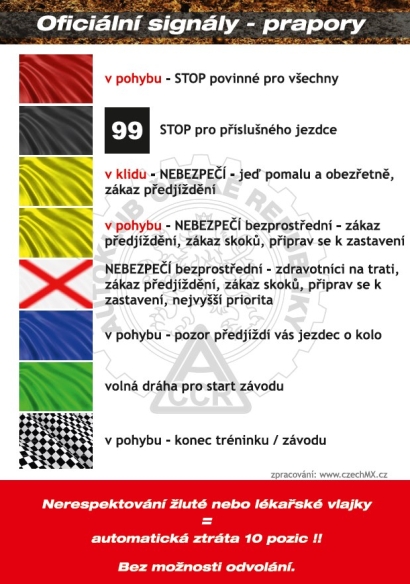 Motokrosová sezóna se nezadržitelně blíží, a tak Vám pro připomenutí přinášíme praktický přehled oficiálních signálů (praporů), které se v motokrosu používají. Tento přehled vytvořil Richard Gironi a najdete ho ZDE.